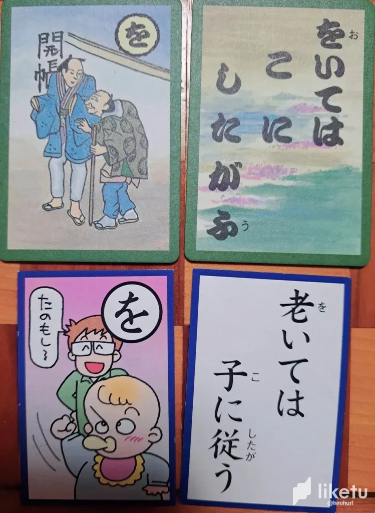 If you look at the first character on the two reading cards in the photo you will see that they are different. The more elegant deck sticks with the traditional twelfth character, “を”, even though the MEANING is quite different. On the other hand my dime-store deck gives us the Chinese character (kanji) – “老” – that shows the actual meaning of the word. The “を” has been placed in smaller script beside it since that is the character that the competitors will be hunting for on the picture card.